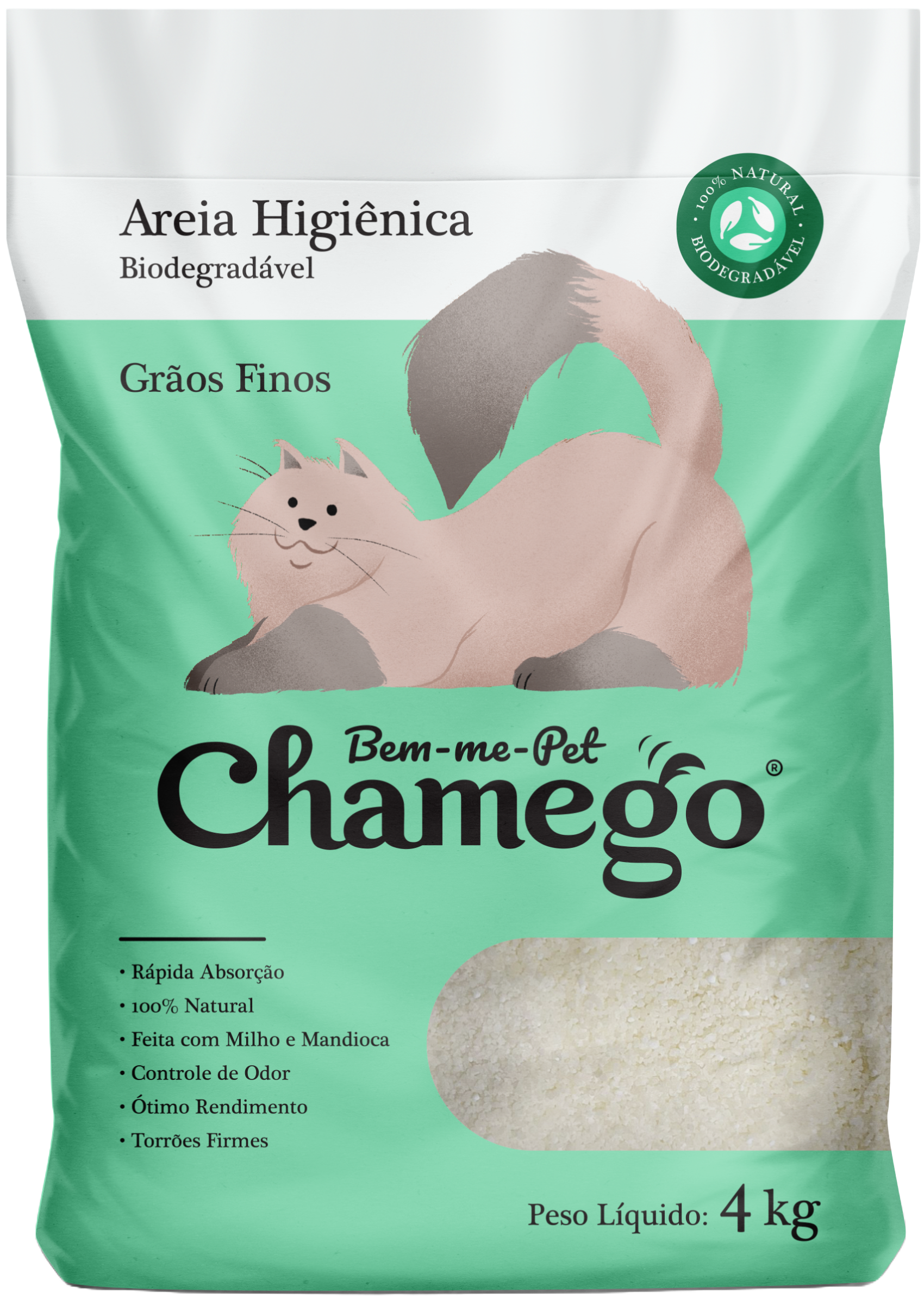 A Areia Higiênica Biodegradável Bem-me-pet Chamego é a solução definitiva para tutores de gatos que buscam o máximo em praticidade, higiene, conforto para o pet e sustentabilidade. Feita a partir de um composto 100% vegetal de mandioca e milho, esta areia de grãos finos oferece um toque suave para as patas sensíveis do seu gato, forma torrões instantâneos e super firmes e, o mais importante: pode ser descartada com segurança direto no vaso sanitário. É o fim da poeira, dos odores desagradáveis e do lixo pesado, representando uma nova era no cuidado com seu felino e com o planeta.