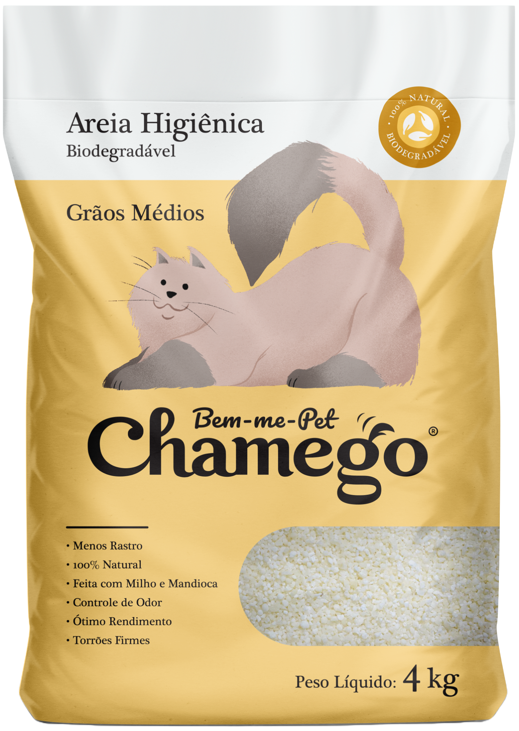 A Areia Higiênica Biodegradável Bem-me-pet Chamego na versão Grãos Médios é a solução ideal para tutores de gatos que amam a praticidade da areia biodegradável, mas se preocupam com os grãos espalhados pela casa. Especialmente desenvolvida para gatos de pelos longos ou para lares que exigem limpeza máxima, esta areia combina todos os benefícios da linha Chamego — torrões instantâneos, descarte no vaso sanitário e controle de odores — com uma granulometria que reduz significativamente os rastros, mantendo sua casa mais limpa e a rotina de higiene ainda mais simples.