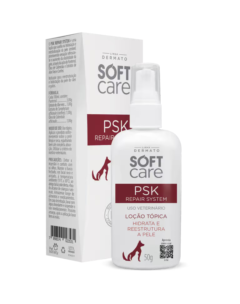 PSK Repair System é uma loção tópica da linha Dermato Soft Care desenvolvida para acelerar a recuperação da pele em cães e gatos. Sua fórmula concentra bioativos em veículo de rápida absorção que promovem hidratação profunda, elasticidade e suporte à regeneração tecidual — indicada para feridas em cicatrização, escoriações, queimaduras leves, lesões por lambedura e uso complementar em curativos.