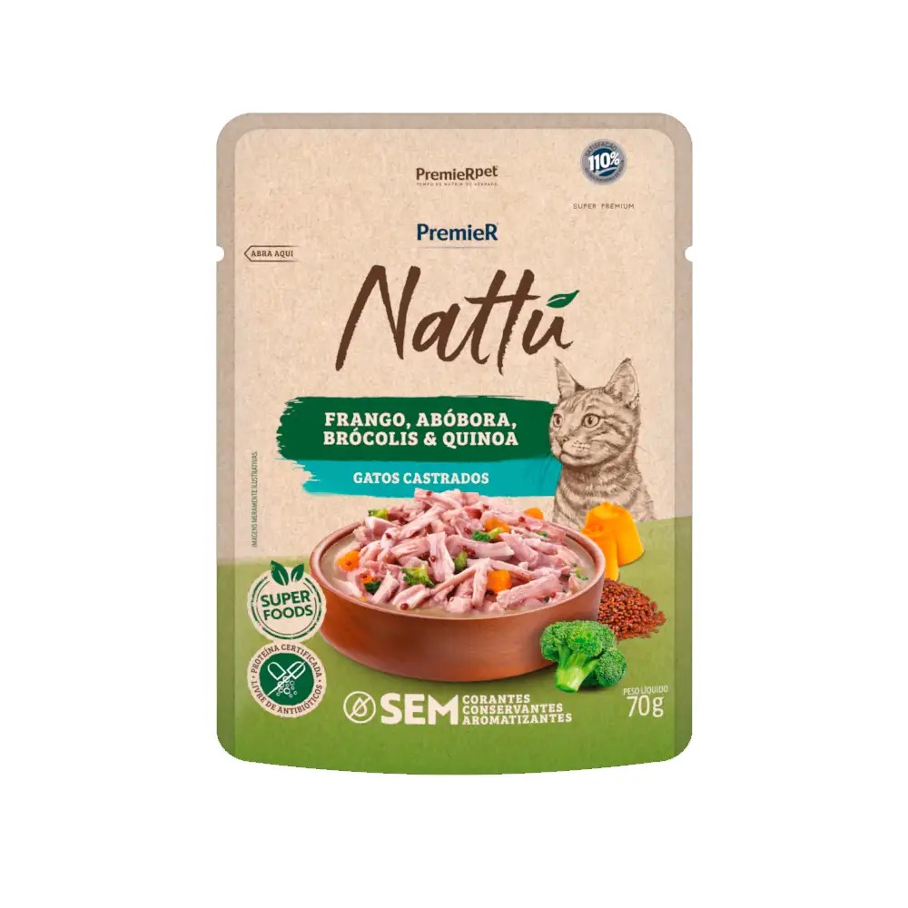 O Sachê Premier Nattu Gatos Adultos Castrados Frango e Abóbora 70g é uma alimentação úmida natural, sem corantes, conservantes e aromatizantes, indicada como petisco para gatos castrados. Contém frango desfiado, abóbora, brócolis e quinoa, proporcionando uma dieta equilibrada e saudável.