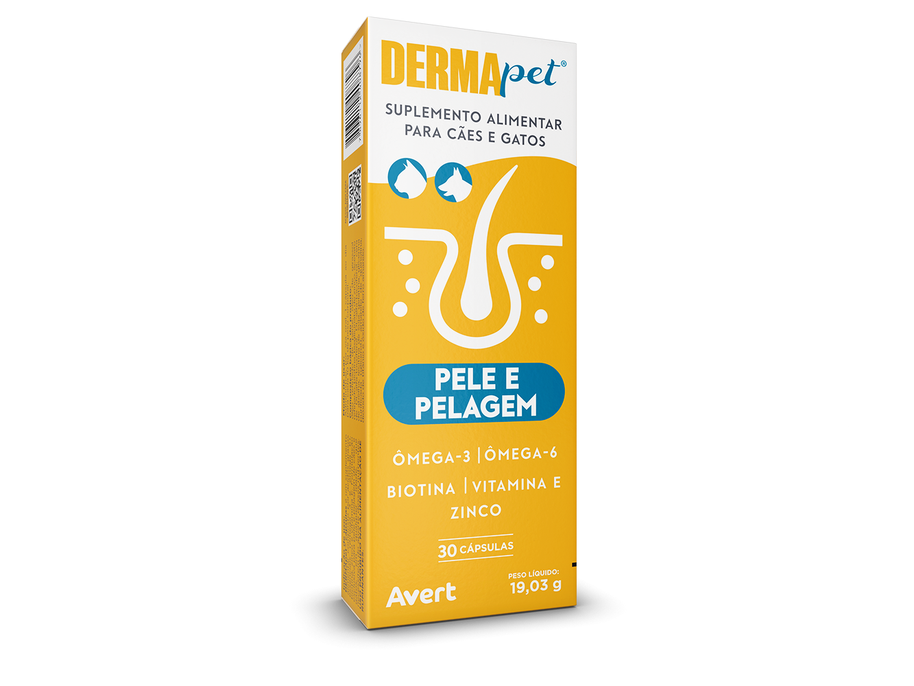 O Suplemento Dermapet da Avert Saúde Animal é a solução nutricional avançada para o suporte dermatológico de cães e gatos. Sua formulação exclusiva combina ácidos graxos essenciais (Ômega 3 e 6), Biotina, Zinco e Vitamina E, atuando de dentro para fora para fortalecer a barreira cutânea, controlar a queda excessiva e promover uma pelagem visivelmente mais sedosa e brilhante.
